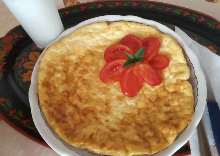 - Яйца взбить с молоком и солью. Сыр натереть на мелкой тёрке и добавляем в яичную смесь. Вылить на разогретую сковороду смазанную маслом и запекаем в духовке до румяной корочки..